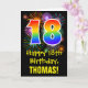 The front of this fun, exciting, and colorful birthday-themed greeting card design features a large number "18" with a rainbow spectrum gradient inspired pattern, along with the message "Happy 18th Birthday,", and a personalized recipient name. The front additionally has a colorful background pattern inspired by the look of bursting celebratory fireworks. The inside features an editable birthday greeting message, or could perhaps be cleared and left blank if a message is to be written by hand instead. A customizable birthday card like this might be a fun way to acknowledge somebody’s eighteenth birthday. [~Z0000442]