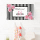 Elegant, glamourous and feminine for a girl's 18th birthday party. Classic and chic slim black and white vertical stripes. Decorated with pink flowers, roses. Templates for a name and the age 18. With the text: Welcome! Girly and elegant! Black and pink letters. The name is written with a modern hand lettered style script.