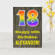 The front of this colorful yet rustic birthday themed greeting card design features a large number "18" with a rainbow spectrum gradient inspired pattern, along with the message "Happy 18th Birthday,", and a personalized recipient name. The background of the front of the card features a rustic faux wood grain style pattern. The inside features a custom birthday greeting message, or could perhaps be cleared and left blank if a message is to be written by hand instead. A customizable birthday card like this might be a fun way to celebrate somebody’s eighteenth birthday. [~Z0000419]