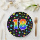This cheerful, colourful, and fun paper plate design features a large number "18" containing a rainbow spectrum gradient inspired pattern. The background features a colourful star shapes pattern. Fun paper plates like this might be used at a party being held to celebrate somebody’s 18th birthday, or a couple’s 18th anniversary, or some other eighteenth event. [~Z0000493]