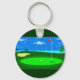 Keychaindepicting a digital illustration of the 18th hole on a golf course with a cloudy blue sky, lake, trees, sand trap and the golf ball sitting on the green, inches away from the cup waiting to be putted in.