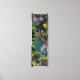 A lovely fine art print of "The Cedar Tree" created by Arthur Sanderson & Sons Ltd., a British manufacturer of fabrics and wallpaper founded in 1860. This particular design dates back to 1910 and was block-printed on machine-made paper. The design boasts a solid black background, against which sits a diagonal branch of cypress from which grows clusters of cypress evergreen sprinkled with large bunches of lilac blossoms and foliage, and hanging clusters of yellow wisteria. On the branch sits a large peacock with a rich, brown body, blue neck and head, and a full luxurious blue tail falling among the blossoms and foliage.
