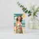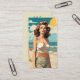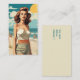 The image is a vibrant pop art-style poster depicting a 1950s summer beach scene. A confident woman with voluminous wavy hair, wearing a stylish white and orange swimsuit, stands prominently in the foreground. In the background, other beachgoers are enjoying various activities along the shoreline, with a bright sun shining in a blue sky dotted with clouds. The overall aesthetic combines retro fashion with a lively, nostalgic atmosphere.