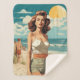 The image is a vibrant pop art-style poster depicting a 1950s summer beach scene. A confident woman with voluminous wavy hair, wearing a stylish white and orange swimsuit, stands prominently in the foreground. In the background, other beachgoers are enjoying various activities along the shoreline, with a bright sun shining in a blue sky dotted with clouds. The overall aesthetic combines retro fashion with a lively, nostalgic atmosphere.