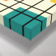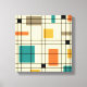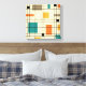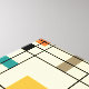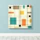 A midcentury modern abstract pattern with black lines and colourful square and rectangle shapes in teal, orange and gold.