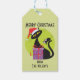 Retro illustration of a black cat in a Santa hat with a mouse and present.