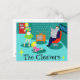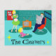 This customizable 1950's Classic Television Postcard features a perfect 1950's family in its natural habitat. They are in their turquoise and teal living room. The father is lounging in his red egg chair, while reading the newspaper. The daughter is sprawled out on the floor in a lovely, pink frock. Her blonde hair is in a ponytail and she is kicked back watching a black and white television show on the bright orange, tube TV set. To the left, the mother is wafting into the room in a flouncy green dress and a white apron with red detailing. Not a hair on her blonde head is out of place. She is carrying a pink, three-layer cake with chocolate frosting. You won't believe the details in this design. The bright, red door in the distance, the retro artwork on the wall, the real newsprint on Dad's newspaper and the black and white housewife vacuuming her 1950's living room on the television set make this absolutely irresistible! Simply click on the "Customize It" icon to replace the existing text with your own. Oh, my stars! They are a 1950's classic television family watching a 1950's classic television show. Is there no end to this brilliance?