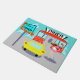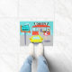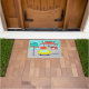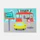 Serve up something special with this 1950's Diner Door Mat. The cartoon drawing design features a red brick building with blue windows, grey double doors, and a white sign that says, "Diner" perched on the roof. In the parking lot, a second sign is on a pole. The sign has a turquoise background and a flashing red arrow pointing the way to, "Don's Diner." The sign has done its job because there is a bright yellow car with fins parked next to it. Even though we can't see them, the passengers of the car must be smacking their lips. A cute, young carhop is rollerskating her way to the car. Her brunette hair is in a bouncy ponytail. She is wearing a short, pink uniform with black trim and a white apron. Balanced on one hand, the carhop is carrying a black tray holding a giant hamburger and a refreshing, old-fashioned, glass bottle of soda. The background behind the diner is teal with light blue clouds and the silhouettes of cedar trees.