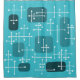A retro mid century modern style abstract art pattern with lines and rounded squares and rectangles. Colours are dark teal, turquoise, and light aquamarine.