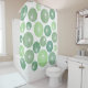 This shower curtain has a mid-century modern design of circles in shades of 1950s green with white starbursts in them, all on a field of white.