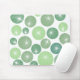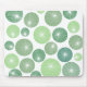 This mouse pad has a mid-century modern design of circles in shades of 1950s green with white starbursts in them, all on a field of white.