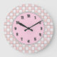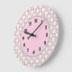 Retro wall clocks with printed pink and white 1950 style ceramic tiles pattern background on the clock face in this decorative wall decor design for your kitchen, dining room, or any room in your house you want to add some colour and character. Colours include pink, black and white.