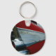 A low and close shot of the side of a classic red and white Chevy Bel Air from the rear, capturing that amazing fin!