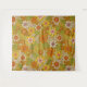 This tapestry features a retro floral pattern, which was inspired by designs from the 1960s and 1970s, with flowers in shades of orange, yellow, pink, and olive green on a green background