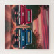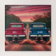 1960s trucks racing down a red dirt road together through the country and kicking up dirt with a pink sky sunset in the distance. The left truck is red, the right is royal blue. Add custom names to the tailgates using our template!