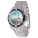 Has heft and feel of expensive stainless steel quartz watches. Good band with safety catch. I removed links, which is easy because engraved arrows show direction to push the linking pins. As always by this seller, the image (a railroad logo) is a perfect reproduction of my emailed image, and is precisely spaced and aligned.