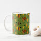 This mug has a mid-century modern 1970s design of diamonds, and starbursts on a field of green.