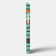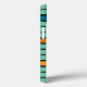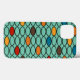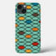 This phone case has a 1970s design of ovals in retro shades of red, blue, orange, and brown on a field of lighter blue.