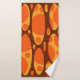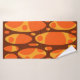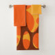 This towel set design has two layers of ovals on a field of yellow, brown, and orange, a yellow washcloth, and an orange hand towel.