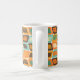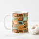 This mug has a mid-century modern design of rounded rectangles leaning to the side with leaning rectangles inside made from lines all in 1970s colours.