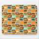 This mouse pad has a mid-century modern design of rounded rectangles leaning to the side with leaning rectangles inside made from lines all in 1970s colours.