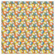 This fabric has mid-century modern design of circles in blue, green, brown, sienna, yellow, and orange with white ovals inside.