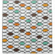 This shower curtain has a 1970s retro design of ovals in white, brown, blue, and two shades of orange.