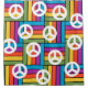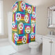 This shower curtain has a design of squares made of rectangles in bright 1970s colors with peace signs scatter around it.