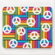 This mouse pad has a design of squares made of rectangles in bright 1970s colours with peace signs scatter around it.