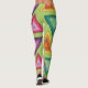 These leggings have a 1970s design on concentric triangles in shades of teal, orange, yellow, purple, and pink on a field of green.