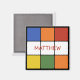 This simple geometric design of square in bright primary colours of orange, blue, red, green, yellow and white set against a black background has a retro 1980s feel. Add your own name or other text to create your own personalized square fridge magnet. Makes a great small gift or stocking stuffer.