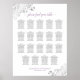 Ce magnifique tableau de sièges mariages propose des assignations de table pour 190 personnes, avec 10 personnes à chaque table. Le design est simple mais élégant avec du gris foncé et du violet clair ou du texte lavande sur un arrière - plan blanc. Il y a des boucles et des tourbillons en faux feuille d'argent en dentelle dans les coins et la calligraphie de script fantaisie lisant "s'il vous plaît trouver votre table."