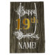 This ornate and luxurious birthday-themed giftbag design features the message “Happy 19th Birthday,”, plus an editable recipient name. Some of the message is in fancy script-style text. The large number “19th” features an imitation/faux gold-inspired look pattern. The background has an imitation/faux woodgrain-inspired pattern. A birthday themed giftbag like this might be a respectable way to wrap a gift or present being given to somebody who is celebrating their 19th birthday. [~Z0000562]