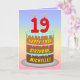 This colourful and fun birthday themed greeting card design features a cartoon-style depiction of a three-tier birthday cake having numeral-shaped candles on top showing the number “19“, along with the message “HAPPY 19TH BIRTHDAY,”, and a personalized recipient name. The background of the front features a multi-colour pastel rainbow spectrum inspired gradient pattern. The inside has a personalized birthday greeting message, or could perhaps be cleared and left blank if a message is to be written by hand instead. An upbeat, customized birthday greeting card like this might be sent in celebration of somebody’s nineteenth birthday. [~Z0000625]
