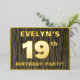 The front of this bold nineteenth birthday celebration/party foil invitation card features a customizable name, a large number “19th”, the message “BIRTHDAY PARTY!”, and a border, all in foil. The background of the front features a rustic, yet elegant, faux wood grain appearance inspired pattern. The back features personalized details about the event, such as the date, time, venue/location, and any other relevant information. Customized invitations like these might be used to invite guests/attendees to a birthday gathering/party being held in celebration of somebody’s 19th birthday. [~Z0000598]
