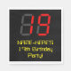 This silly and fun birthday-themed paper napkin design features a large number "19" with a red seven segment digital display inspired appearance, along with a personalized name and the message "19th Birthday Party!" in geeky yellow text, on a black coloured background. Fun, personalized birthday themed paper napkins like this might be used at somebody’s 19th birthday celebration. [~Z0000388]