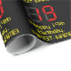 This fun and silly birthday themed wrapping paper design features a large number "19" having a red seven segment digital display style appearance, along with the message "Happy 19th Birthday," and a personalized name in geeky yellow text, on a black coloured background. Wrapping paper like this might be used when wrapping gifts being given to somebody in celebration of their nineteenth birthday. [~Z0000387]