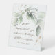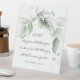 Christian Wedding Pedestal Sign depicts an elegant floral watercolor greenery design including eucalyptus and graceful flowing leaves with gold splashes. It features a portion of Bible Verse 1 Corinthians 13:7-8, "LOVE… hopes all things, endures all things, LOVE never fails."