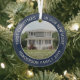 Celebrate the joy of your new place with a custom photo "First Christmas in our New Home" navy blue and white round glass ornament. Picture and wording on this template are simple to personalize. (IMAGE & TEXT DESIGN TIPS: 1) To adjust position of text, add spaces at beginning or end. 2) To center the photo exactly how you want, crop it into a square shape before uploading to the Zazzle website.) Elegant dark blue and white border design features stylish modern minimalist typography name & year, new address, and 1 image of your choice. This unique family keepsake adds a stylish touch to Xmas home decorations or makes a thoughtful housewarming realtor gift idea. There's no place like a new home for the holidays!
