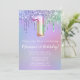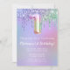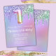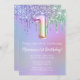 1ère fête d'anniversaire Invitation rose violet parties scintillant gouttes 1ère fête d'anniversaire pour une fille de 1 an avec écriture de script moderne et des ballons de papier amusant.
