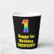 This colourful and exciting birthday paper cup design features a large number “1” having a rainbow spectrum gradient inspired pattern. It also features the message “Happy 1st Birthday,”, and an editable name. The background is coloured black. Vibrant, colourful paper cups like this might be fun to have at a birthday party/celebration being held to celebrate somebody’s 1st birthday. [~Z0000537]
