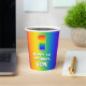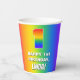 This joyful and cheerful birthday themed paper cup design features a large number “1” having a colourful rainbow spectrum inspired gradient pattern. It also features the message “HAPPY 1st BIRTHDAY,”, and a personalized name. The background also features a fun multicolored rainbow spectrum inspired gradient pattern. Paper cups like this might be used at a birthday party held in celebration of somebody’s first birthday. [~Z0000576]