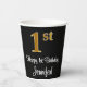 This sophisticated, elegant, and stylish birthday paper cup design features a large ordinal number “1st” having an imitation/faux gold-like look, plus the birthday greeting message “Happy 1st Birthday,” and an editable name in a script-style font. It also has a black-coloured background. Paper cups like this might be use at a birthday party for somebody who is celebrating their 1st birthday. [~Z0000538]