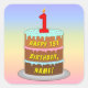 This upbeat and joyful birthday-themed square sticker design features a cartoon-style depiction of a three-tier birthday cake having a number-shaped candle on top showing the age “1“, along with the message “HAPPY 1ST BIRTHDAY,”, and an editable recipient name. The background features a multicolored pastel rainbow spectrum inspired gradient pattern. Colourful birthday themed stickers like these might be given out or used at a birthday party celebrating somebody’s first birthday, or perhaps used when preparing invitations or gifts for such an event. [~Z0000624]