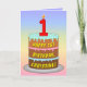 This colourful and upbeat birthday-themed greeting card design features a cartoon-style depiction of a three-tier birthday cake having a numeral-shaped candle on top showing the number “1“, along with the message “HAPPY 1ST BIRTHDAY,”, and a custom recipient name. The background of the front has a multi-colour pastel rainbow spectrum inspired gradient pattern. The inside features a customized birthday greeting message, or could perhaps be cleared and left blank if a message is to be written by hand instead. A joyful, editable birthday greeting card like this might be a fun way to send some birthday wishes to somebody who is celebrating their first birthday. [~Z0000625]