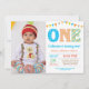 1st Birthday Invitation with custom photo. Boy First Birthday Invitation.Turning one birthday party. Pink, Purple, Orange, Yellow, Green, Blue, Teal, Aqua. Stripes. White Background. For further customization, please click the "Customize it" button and use our design tool to modify this template.