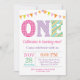 1st Birthday Invitation. Girl First Birthday Invitation.Turning one birthday party. Pink, Purple, Orange, Yellow, Green, Blue, Teal, Aqua. Stripes. White Background. For further customization, please click the "Customize it" button and use our design tool to modify this template.