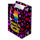 This colourful and fun birthday themed gift bag design features a large number “1” having a rainbow spectrum gradient inspired pattern. It also features the message “Happy 1st Birthday,”, and a custom name. The background features a pattern of heart shapes with colours like purple, red, and pink. A joyful birthday themed giftbag like this might be used when giving a gift or present in celebration of somebody’s first birthday. [~Z0000551]
