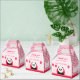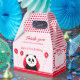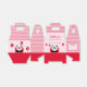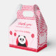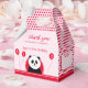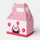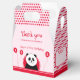 A smiling panda and red party balloons decorate the front and back of this box in celebration of a boy or girl's first birthday. The text on the top and front of the box is fully editable and currently reads "Thank you" "FOR HELPING US CELEBRATE" "Jayne's First Birthday". On the side of the box there is further editable text, with a suggestion to note the name of the recipient: "This party box belongs to". The box background colour is pink and a pattern of red dots completes the design.