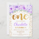 Elegant design in faux glitter gold with greenery and floral accent. Invite card with glitter "One" in script font with confetti. Purple, white and mint green. Perfect for a stylish 1st bday celebration.